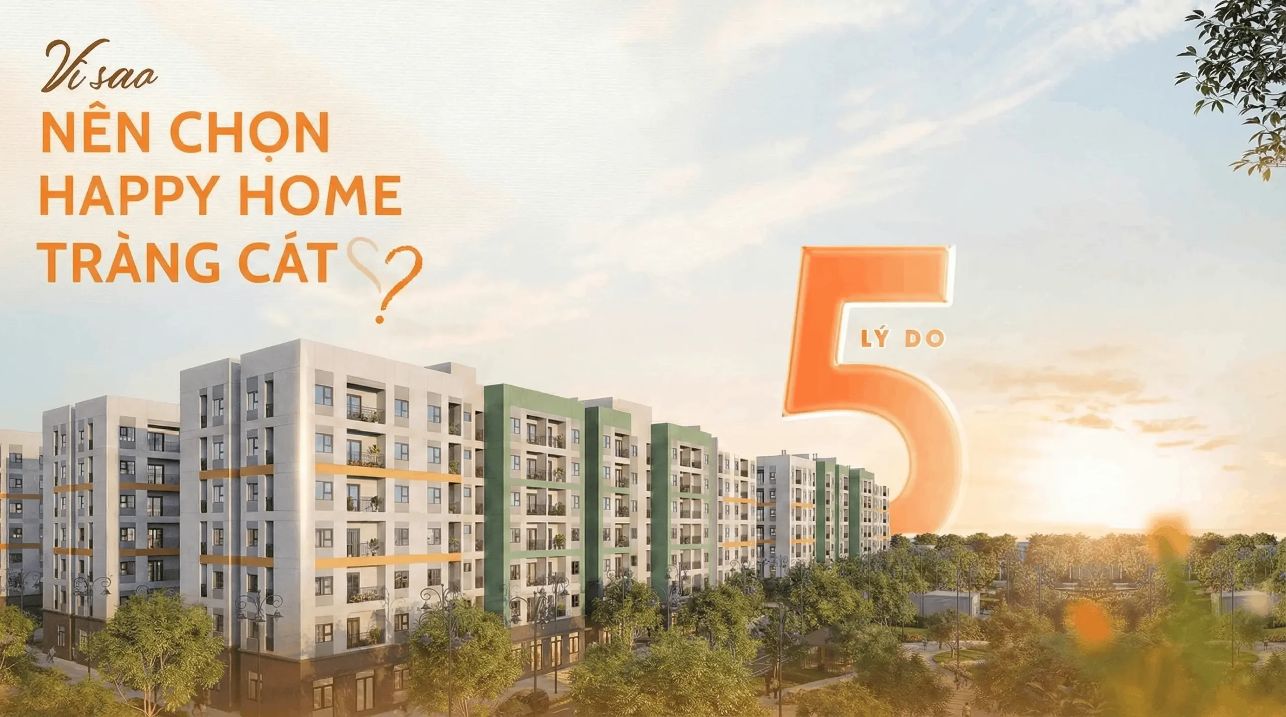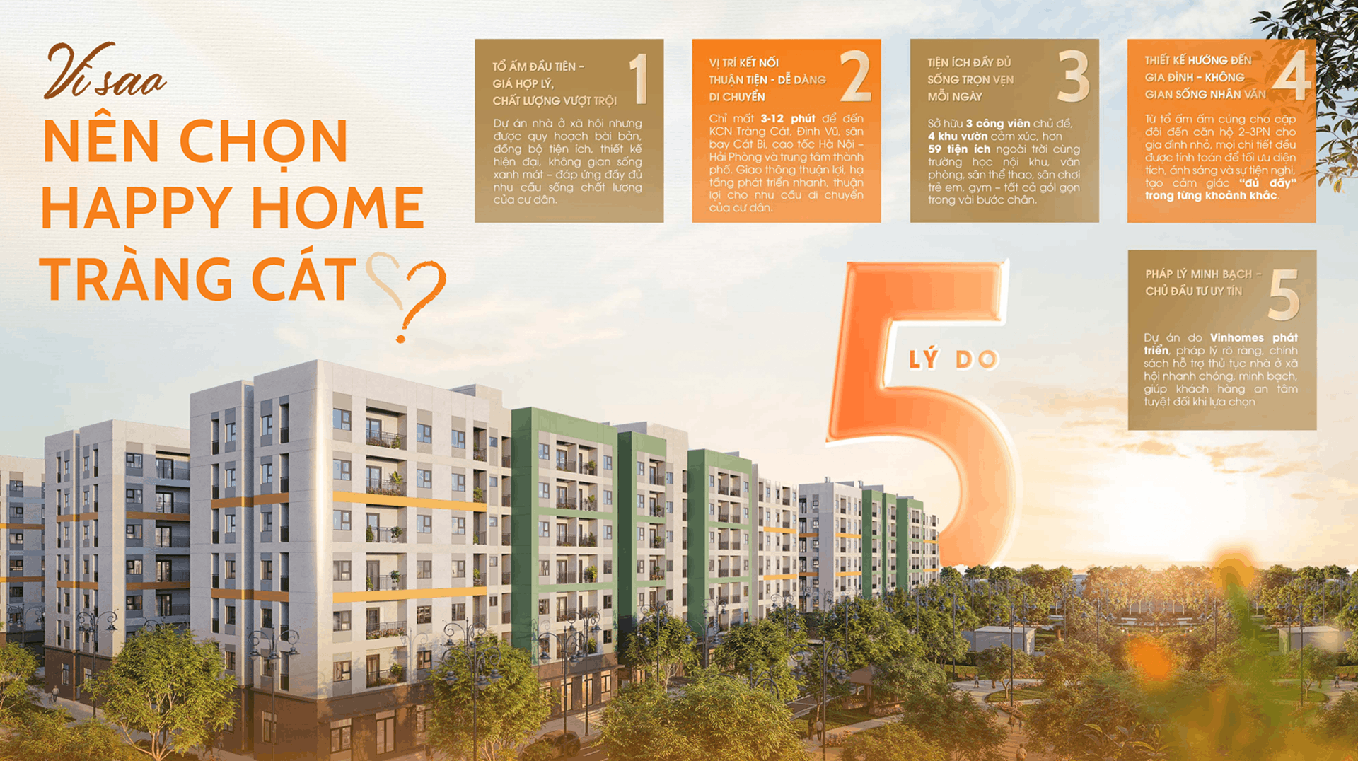 Happy Home Tràng Cát được tạo nên không phải để trở thành nơi ở sang trọng nhất, mà là nơi ấm áp nhất, nơi đủ gần công việc, đủ xanh để hít thở, đủ yên để nghỉ ngơi, và đủ đầy yêu thương để mỗi ngày đều đáng sống. Dành cho người trẻ bắt đầu hành trình riêng, cho gia đình nhỏ đang vun đắp từng điều bình dị – nơi đây chính là mái nhà đầu tiên, nhưng là nền tảng lâu dài cho một tương lai bền vững. Là dự án nhà ở xã hội được đầu tư bởi Vinhomes, Happy Home Tràng Cát không chỉ mang đến những căn hộ với mức giá hợp lý, mà còn kiến tạo một không gian sống xanh mát, tiện nghi, gắn kết…nơi bạn không chỉ có một chỗ ở, mà có cả một cộng đồng, một cuộc sống, một tương lai.