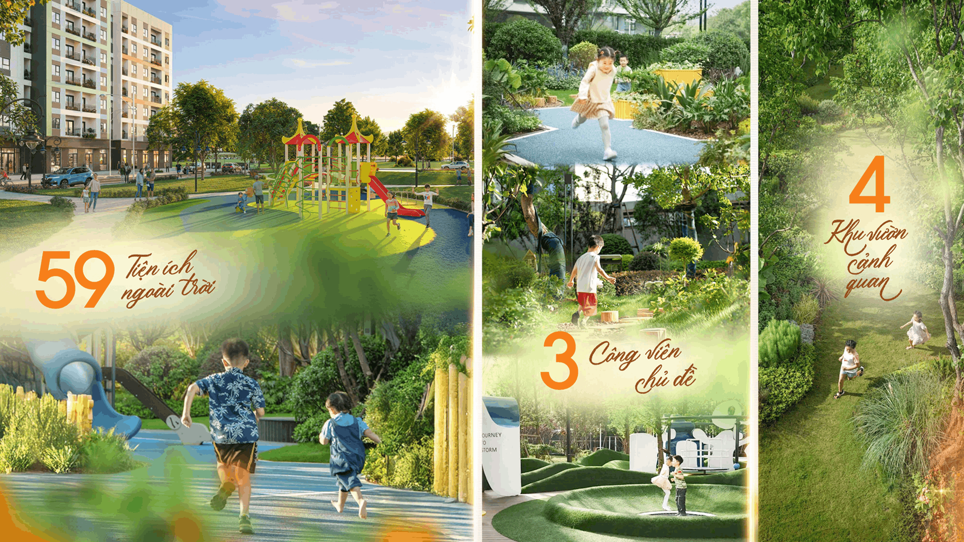 Với 59 tiện ích ngoài trời được bố trí rộng khắp: 3 công viên, 4 vườn hoa, quảng trường, khu thể thao (sân yoga, gym, cầu lông…), khu cắm trại, vườn cờ, khu đọc sách… tạo nên môi trường sống năng động, kết nối và đầy cảm hứng. Dự án cũng liền kề 3 trường học liên cấp, trạm y tế phường và 2 tòa nhà văn phòng, đáp ứng đầy đủ các nhu cầu học tập, chăm sóc sức khỏe và việc làm cho cư dân.